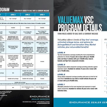 Add Partner with ValueMax to offer dealers a flexible, four-tier vehicle service contract (VSC) program that fits every inventory and customer—from affordable Level 1 to exclusive Level 4 exclusionary protection. With Day-One coverage, unlimited mileage options, Salvage/Canadian Grey Market add-ons, and value-added benefits like trip inte